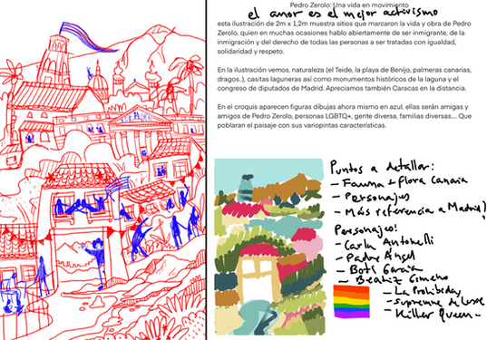 This illustration pays tribute to the politician and activist Pedro Zerolo, a symbol of the defense of equality, diversity, and human rights. It intertwines Canary Islands landscapes such as Mount Teide, Benijo Beach, dragon trees, and palm trees, with brightly colored houses from La Laguna and iconic monuments such as the Congress of Deputies in Madrid. Caracas can also be glimpsed, recalling his roots. The canvas is inhabited by diverse people—families, friends, and the LGBTQ+ community, celebrating freedom and harmonious coexistence. With a vibrant style full of detail, the work reflects an open, joyful, and plural world, where love, as Zerolo used to say, becomes the finest form of activism.